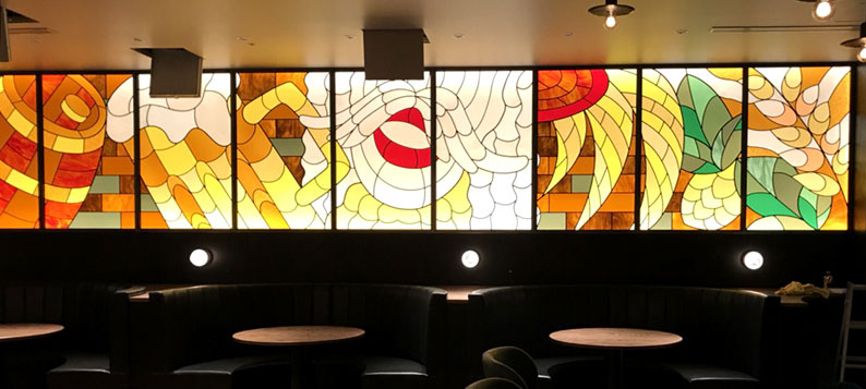 来ました。 このお店は、大阪に古くからあるビールと唐揚げが有名な老舗で 僕は今回、店内のステンドグラスのアートワークを手掛けさせてい ただきました。 カジュアルでシックな内装は、スペースデザイナーの石丸くんで、 全体のバランスが 美しく新しい現代のビアホールといった感じでしょうか・・・ 小さなお子様向けのファミリーブースなんかもあって、とても気が 利いています。 お近くにお越しの際は、是非チェックしてみて下さい。 あっ、大きな海老フライとプリンも美味しかったです。 |